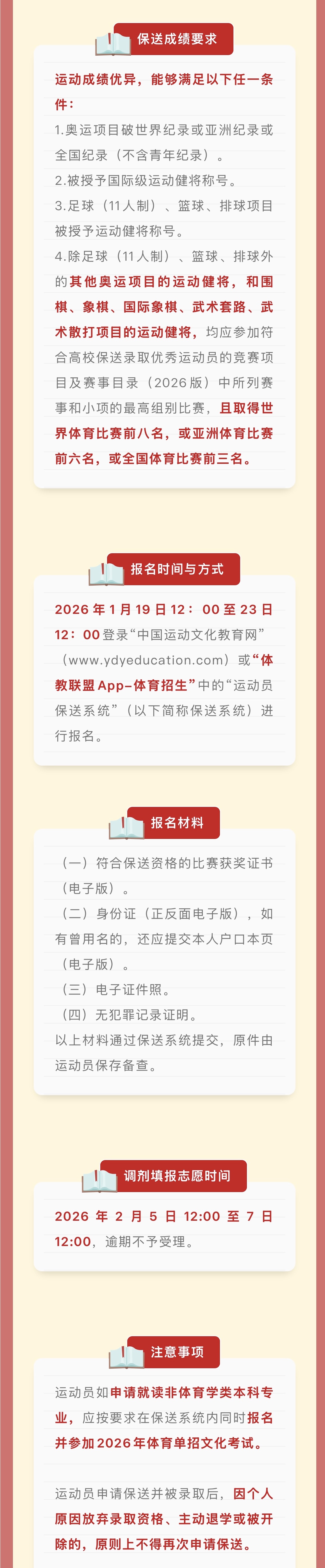 体育总局办公厅近期发布《关于做好2026年高校保送录取优秀运动员有关事宜的通知》,今天小编整理了《通知》中运动员需要重点关注的信息,一起来看: