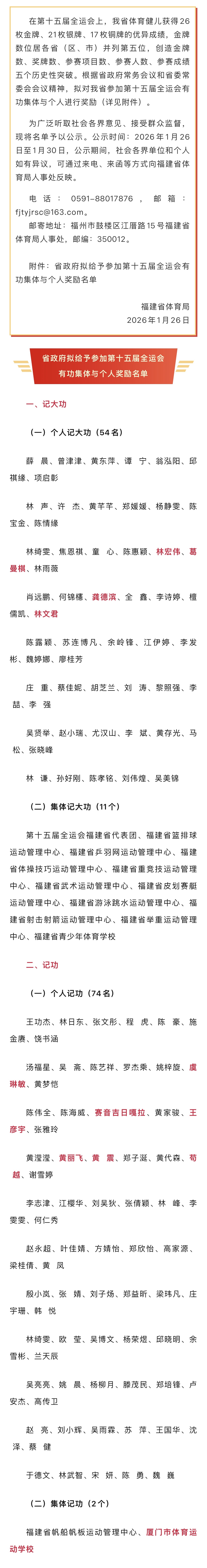 1月26日,福建省体育局发布关于第十五届全运会有功集体与个人奖励名单的公示。其中,厦门运动员林宏伟、葛曼棋、龚德滨、林文君拟获个人记大功,虞琳敏、赛音吉日嘎拉、王彦宇、黄丽飞、黄震、苟越、魏巍拟获个人记功,厦门市体育运动学校拟获集体记功。