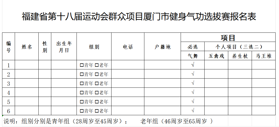 依据《福建省第十八届运动会群众项目健身气功比赛竞赛规程》及《福建省第十八届运动会群众比赛厦门代表团选拔办法》的相关规定,为选拔健身气功项目优秀队员代表厦门市出征,特制定本选拔办法。