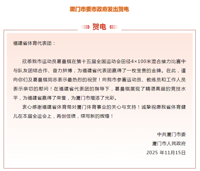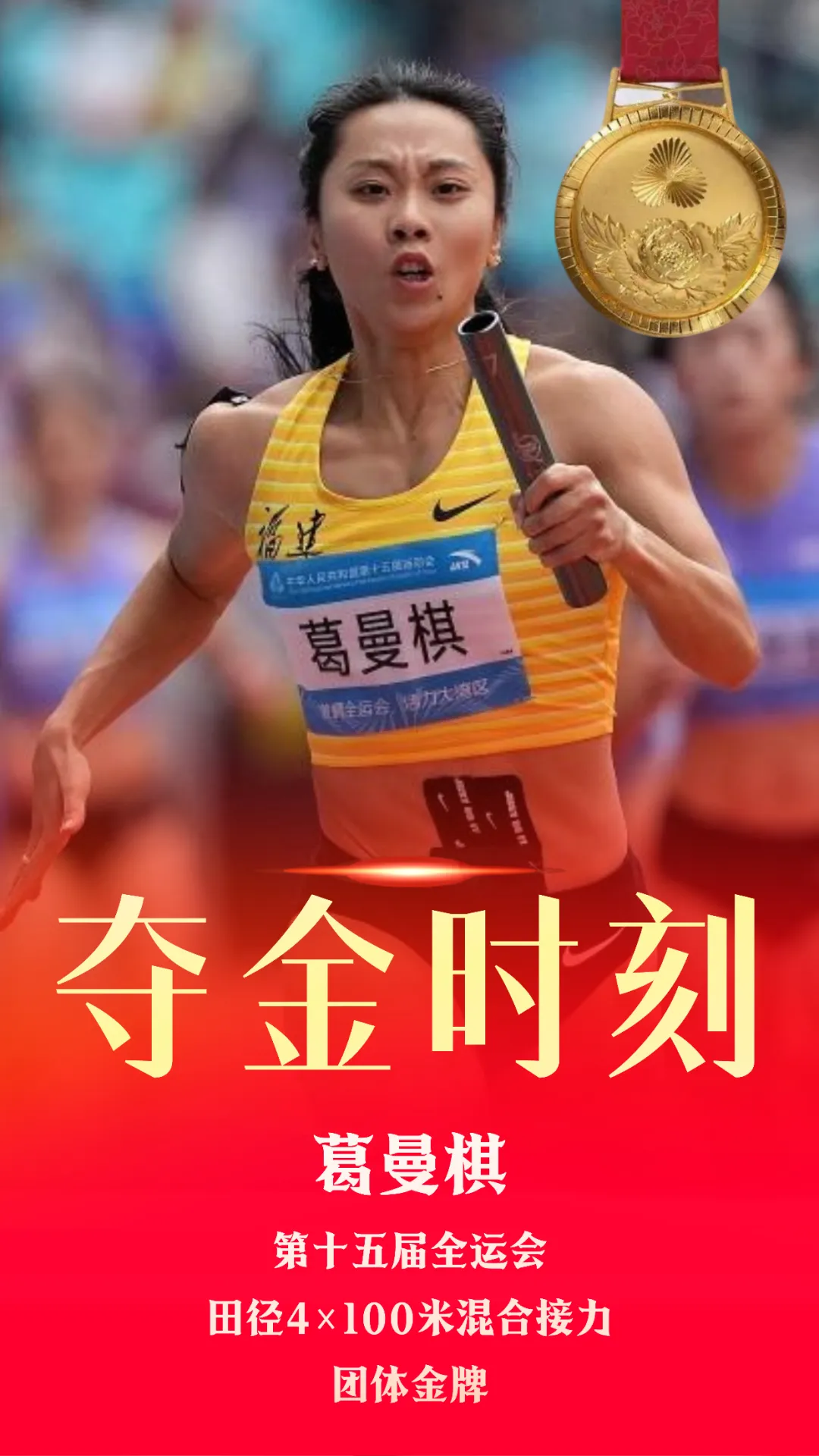 11月15日晚,厦门市运动员葛曼棋在第十五届全运会田径4×100米混合接力比赛中,携手林雨薇、肖远鹏、何锦櫶以40.37秒的成绩夺得金牌,这是厦门在本届全运会竞技体育项目上的首枚金牌!