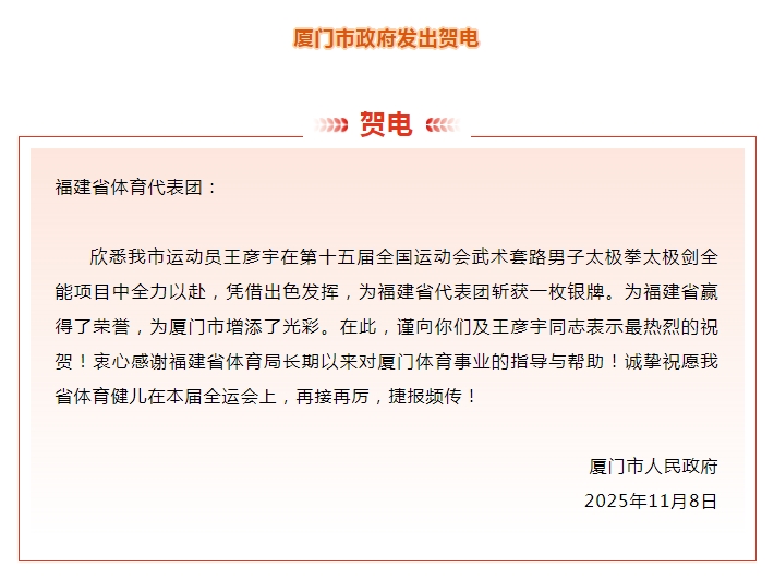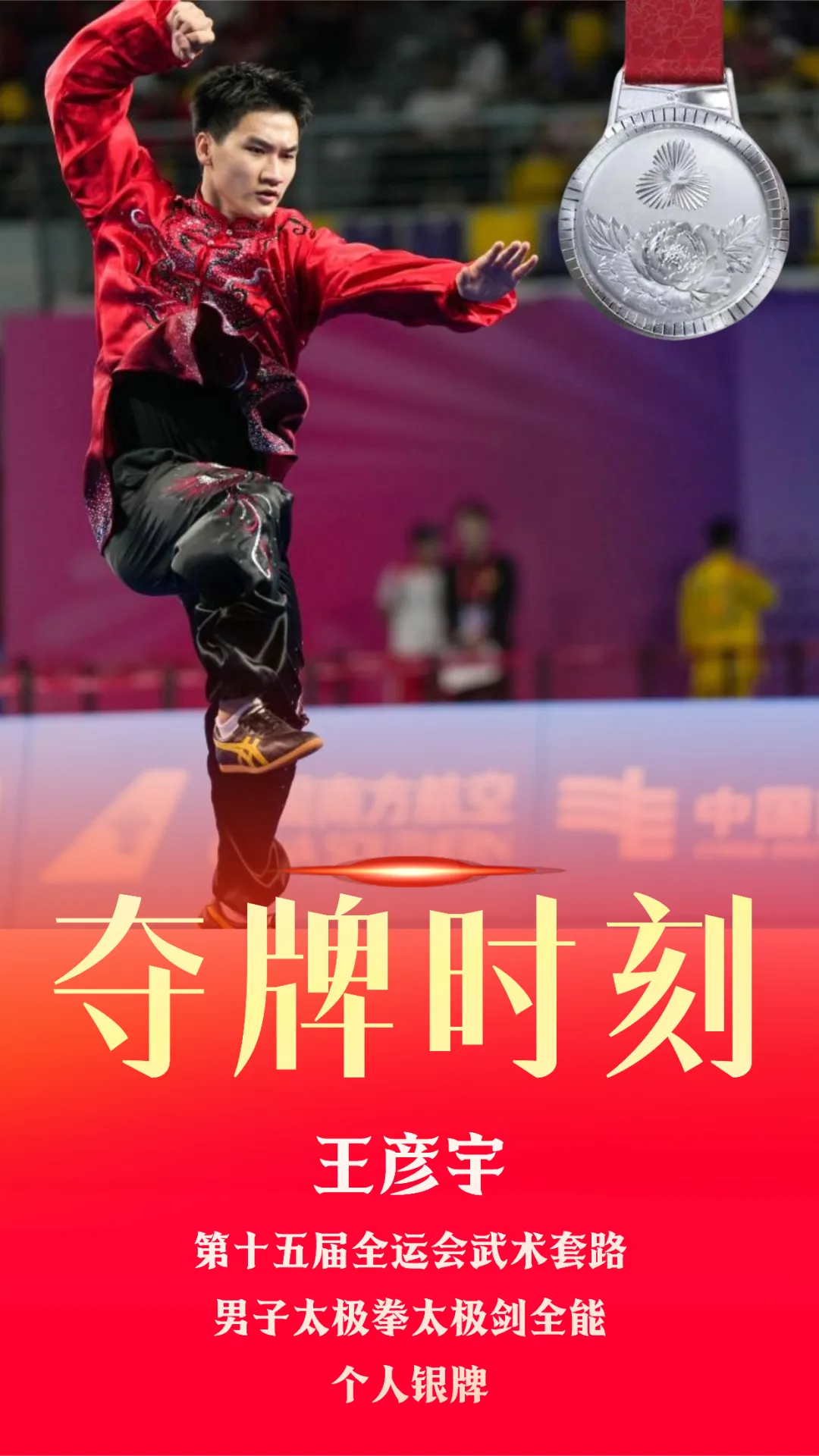 11月8日,厦门市运动员王彦宇在第十五届全运会武术套路男子太极拳太极剑全能项目中夺得银牌!